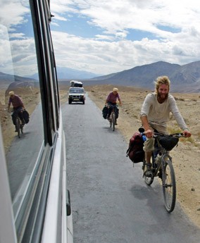 Foreign travelers ride bicycles at Nimu. The Buddhist dominated Ladakh region is a famous destination for its monasteries, landscapes, mountains and rich cultural heritage. REUTERS/Fayaz Kabli