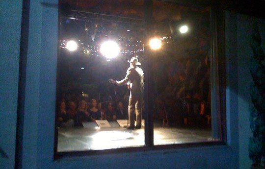 Seen from outside Esther's Follies on 6th Street, a musician plays in the venue's window-front stage.