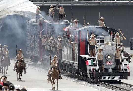 Mexican troops wearing period costumes take part in the re-enactment of historic battles during bicentennial celebrations this week in Mexico City. (REUTERS/Henry Romero)