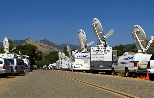 Michael Jackson via satellite: Media vehicles outside Michael Jackson's Neverland Ranch in Los Olivos, California, in June 2005. REUTERS/Lucas Jackson