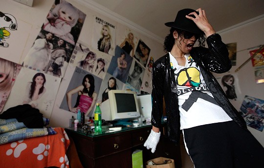 Michael Jackson look-alike Wu Di, who has been performing as Michael Jackson in bars for two years, poses in his bedroom in Beijing. REUTERS/Reinhard Krause