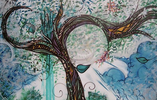 This image of a wind-blown tree in Beco do Batman is by the artist known as Mea.