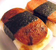 I’ve been face-to-face with Spam musubi—a block of rice topped with Spam and wrapped in seaweed—at ukulele club events because friends raised in Hawaii will insist on bringing big Tupperware containers of the stuff to picnics and potlucks. I’ve tried it more than once and I’ve yet to convince myself that I like it. I’m not much of a carnivore, plus, Spam reminds me too much of the deviled meat sandwiches of my grade school days. I can still picture the shiny blocks of plastic-wrapped Spam musubi under lights in the food court across from our Honolulu hotel—no sight has ever left me with a stronger craving for salad.