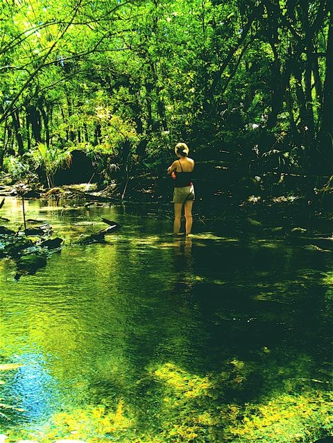 There are lots of little freshwater springs tucked away in the tropical landscape of Florida, the Yucatan, Central America, and so on. My favorites are always the ones that are far off trails, and have no signs pointing the way. Such as this one my good friend Yvette Comeau and I just experienced; a deep pool to the fore and a shallow run through the lush jungle foliage to the aft, where she’s wading.